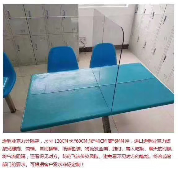 在日常的通勤中可以使用口罩保護,但是在外進餐時的安全就很難保障,在人流量大的地方就餐位置本來就一個難求,考慮到這些鄭州非凡亞克力廠家結(jié)合網(wǎng)上信息生產(chǎn)了大量透明亞克力隔離板以備各個場所使用。