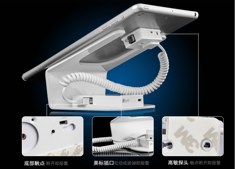 (2)亞克力iPad展架內(nèi)有隱藏式蜂窩報(bào)警器,能在喧鬧的賣場(chǎng)發(fā)出高達(dá)105分貝的報(bào)警聲