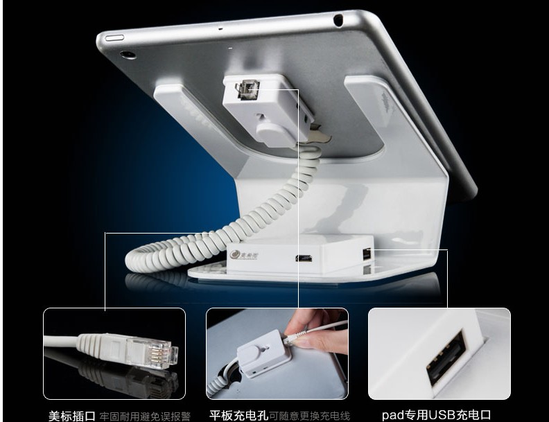 3亞克力iPad展架充電防盜一體式設(shè)計(jì),可自由更換充電線,能滿足絕大多數(shù)電子產(chǎn)品的充電需求.